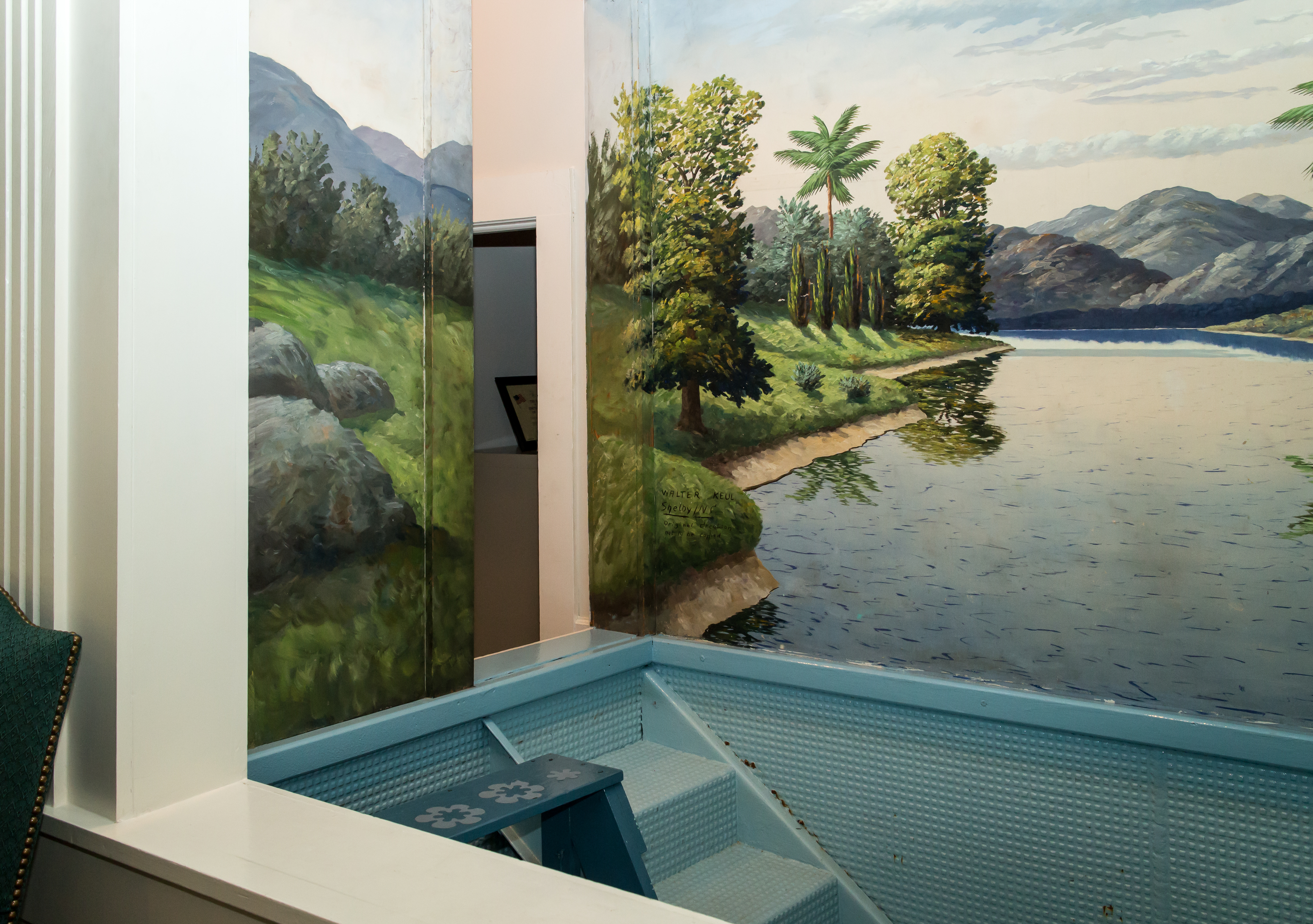 View to the left, which is the entrance into the baptistry. The wooden steps are placed outside of the baptistry door for the pastor and the person being baptized to step up into the baptistry and walk down into the water on metal steps. This painting is also continued along the side walls, so that the person being baptized has a view of the “bank” of the river while standing in the water.
