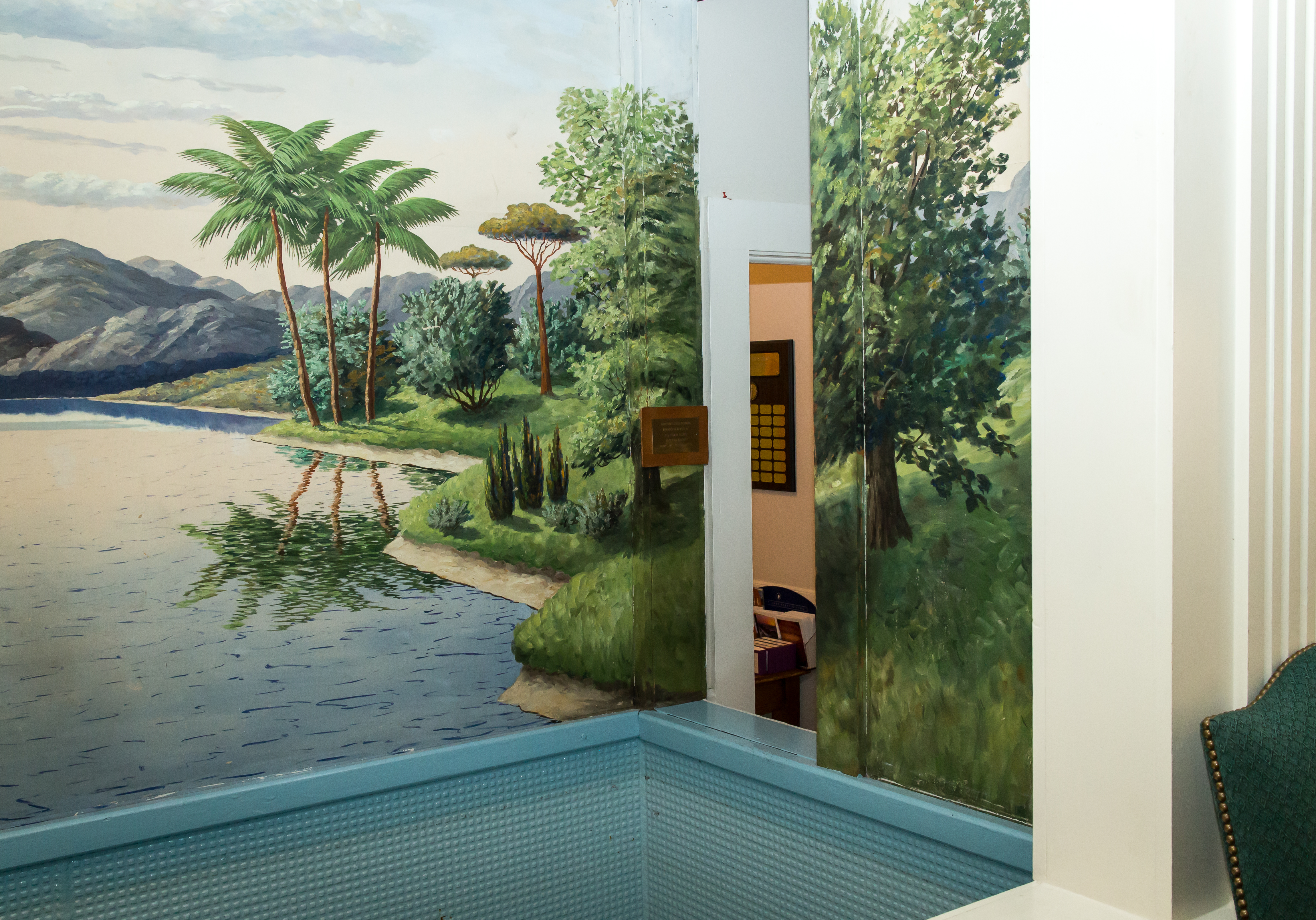 View of the right side of the baptistry. The dedication plaque is on the wall close to the center of this photograph. The plaque states that the painting was completed in memory of Rev. Isom W. Vestal, who served as pastor for a few months in 1939 and passed away late that same year. He is buried at the Fall Creek Baptist Church cemetery in Jonesville, a church which helped to start the Arlington First Baptist Church.